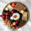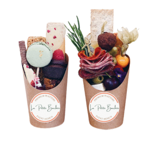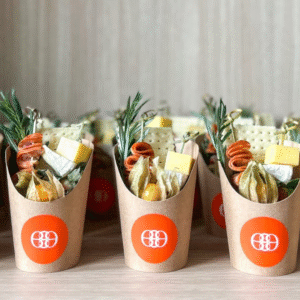 Savory: 1 slice of Brie , Breadstick/cracker, Cold cut, Olive, 3 types of fruits (All ingredients would be arranged in the cup with long wooden sticks)