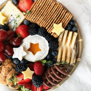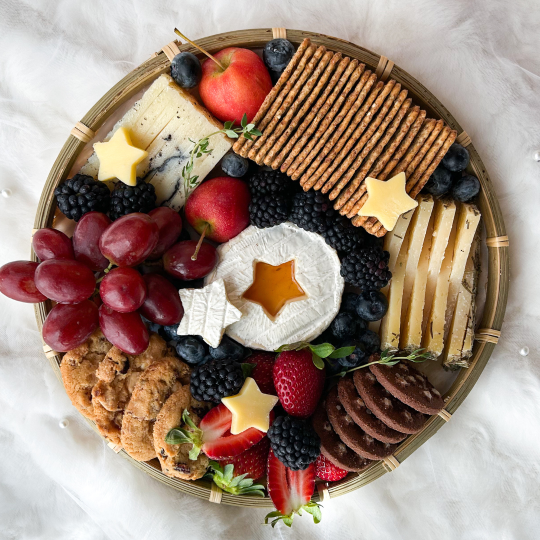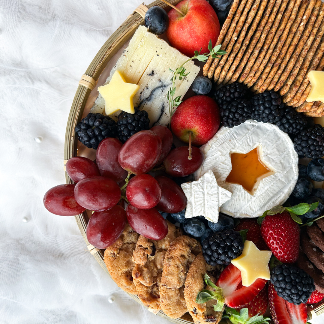 26cm Bamboo Tray consists of Cranberry white Chocolate Cookies, Italian Chocolate Cookies, Truffle Manchego, rosemary Manchego, French Brie, Mild cheddar stars, Rosemary & sea salt crackers, Grapes, Strawberries, Blackberries, Mini Strawberry Apples & Blueberries